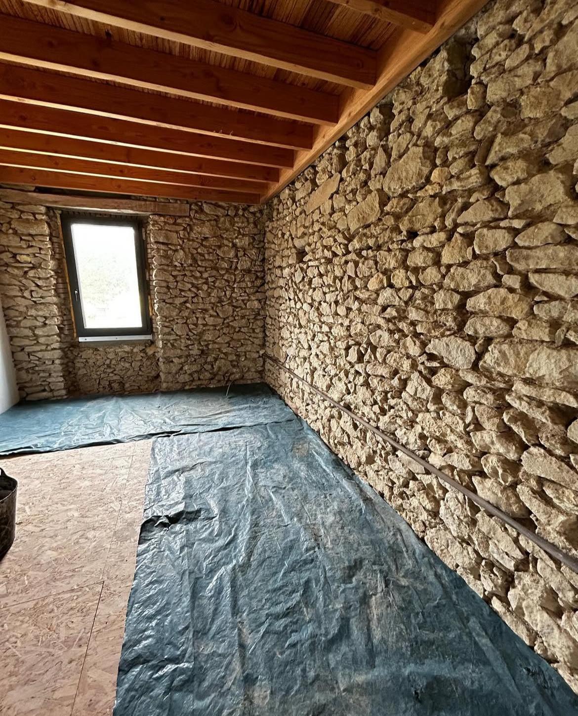La mise en valeur du mur en pierre de la chambre a été réalisée avec un rejointoiement à la chaux blanche traditionnel :